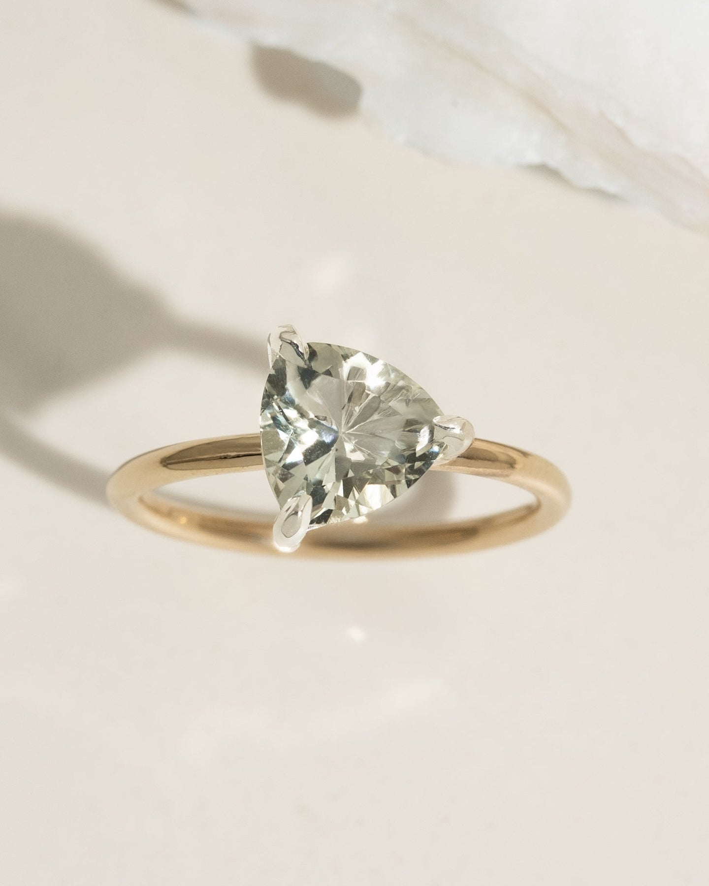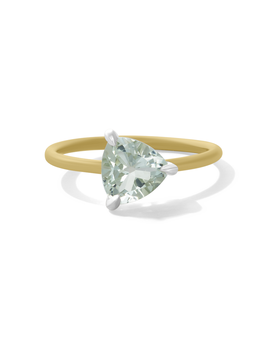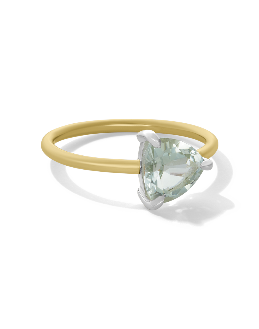Material: 14k gold fill band, sterling silver setting Dimensions: 8mm trillion cut green amethyst