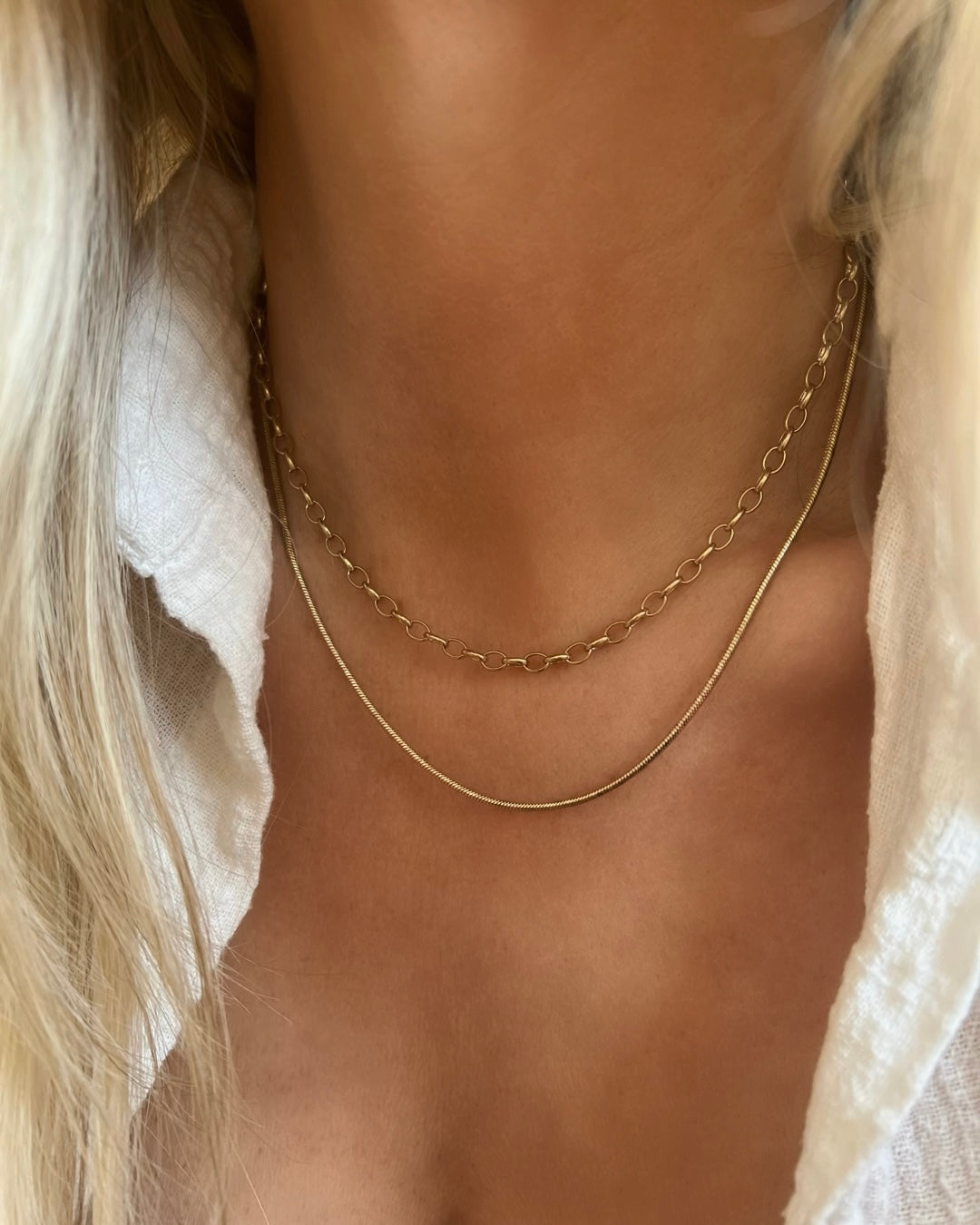 Material: Waterproof, tarnish proof, and hypoallergenic, crafted from brass with a durable 10k gold PVD coating Chains: Set includes one 16" oval link chain (4mm width), and one 18" round snake chain (2mm width)