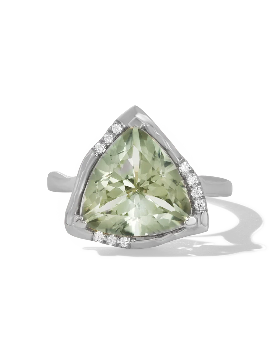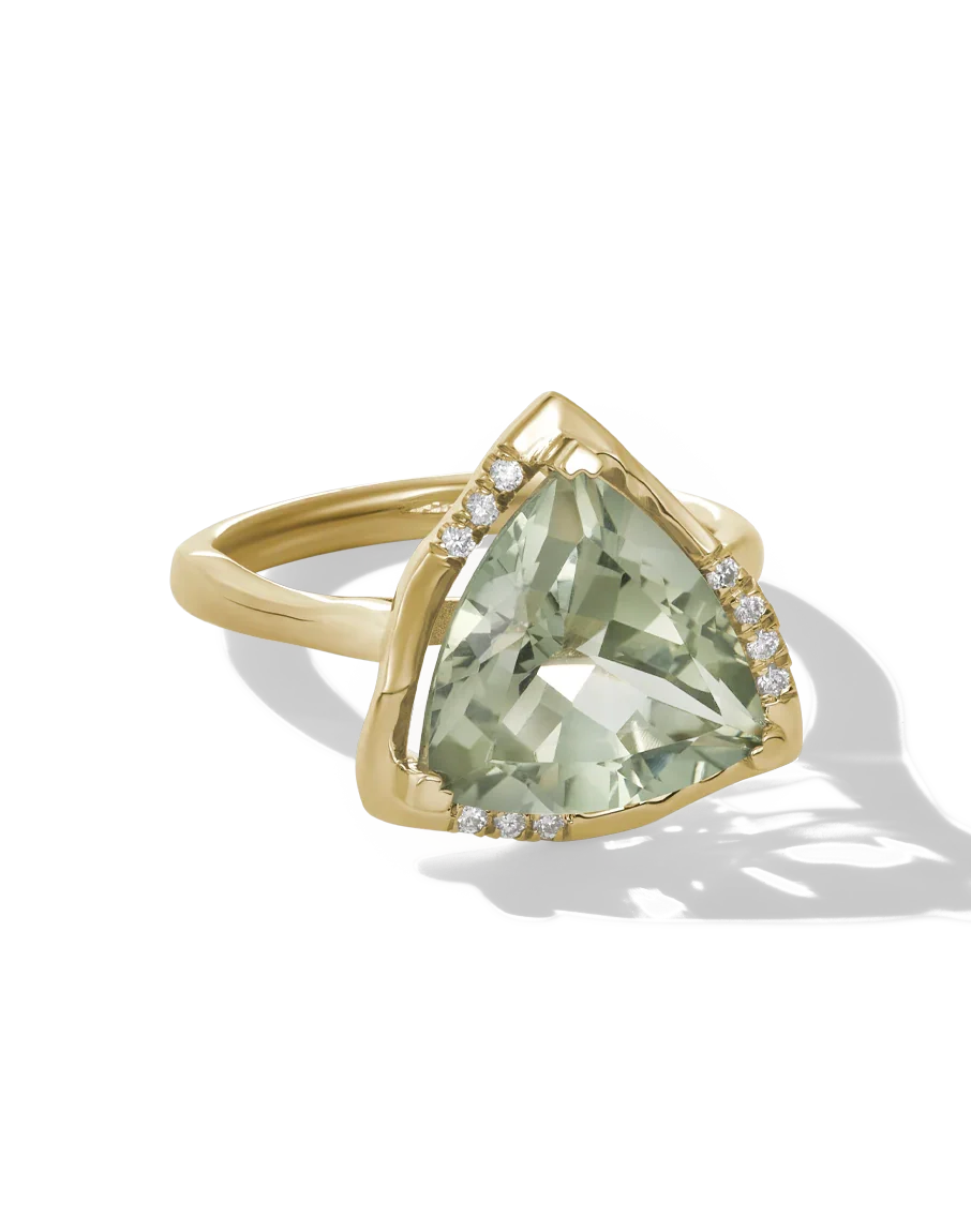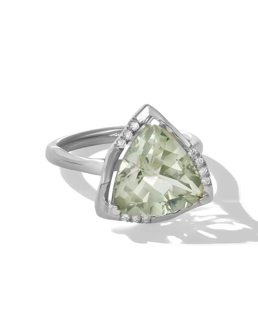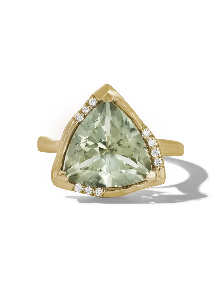 Material:14k solid yellow gold or 14k solid white gold Stone: trillion cut green amethyst (12mm), lab grown diamonds, 0.12 carat, VS clarity Dimensions: 13mm (ring face)